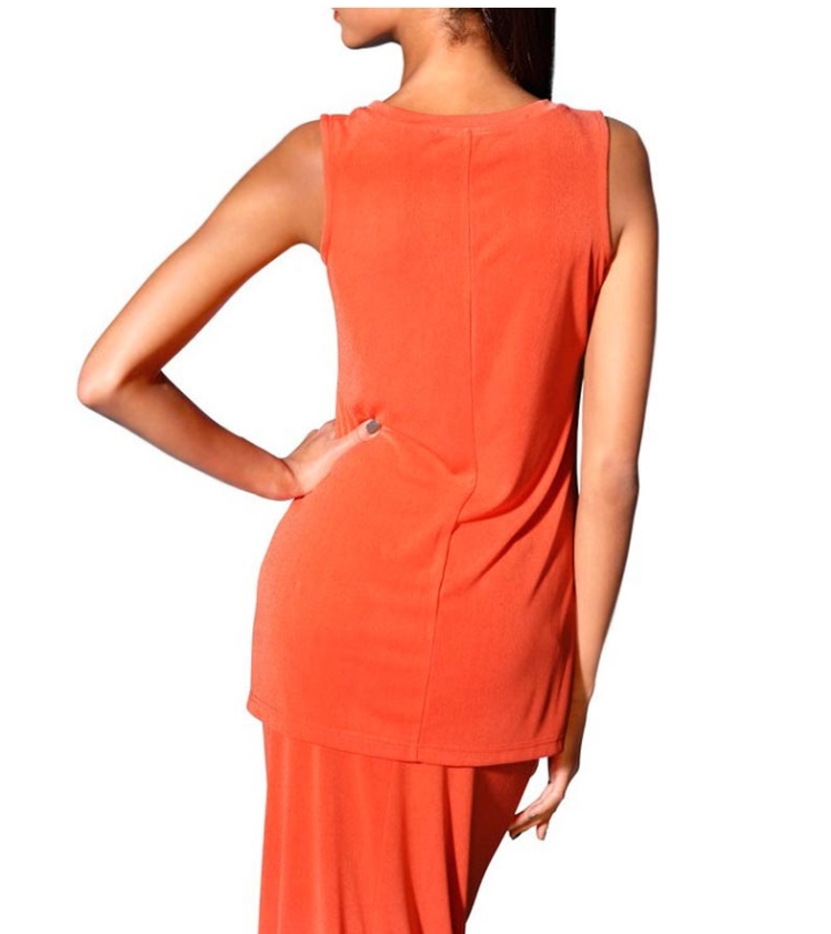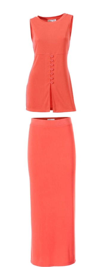 Subtle Elegance: The refined shade of orange exudes extravagance while letting the beautiful details take center stage. An enchanting shirt top with a round neckline and a decorative loop-button placket that opens into a slit. Length approx. 72 cm. Figure-hugging fit. Skirt with elastic waistband and back slit. Slim silhouette. Length approx. 90 cm. Crafted from a pleasantly dense jersey fabric for ultimate comfort, made of 95% polyester / 5% elastane.