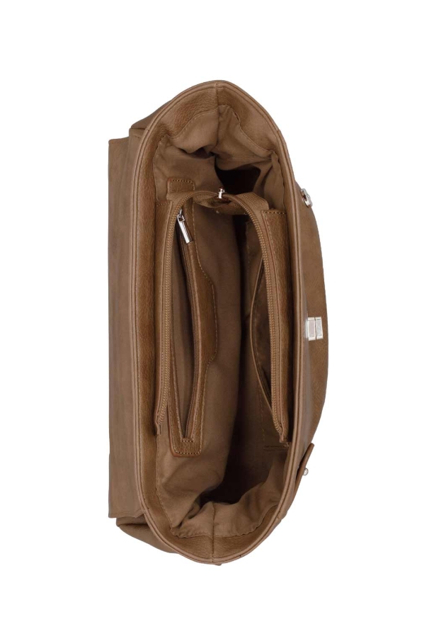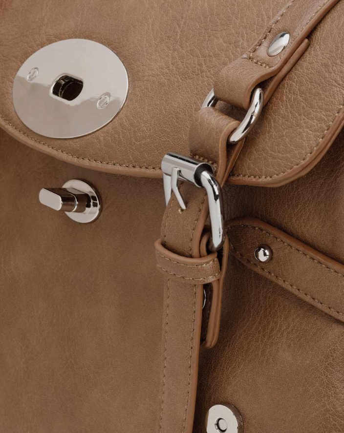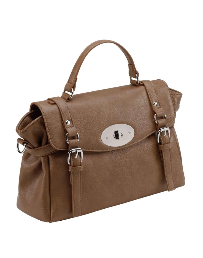 Your sophisticated city companion made from soft faux leather elevates your style with elegance and class! Refined handbag featuring decorative buckles on the front and a chic metal emblem on the closure. Includes a short handle and an adjustable, detachable shoulder strap. Interior with zip pocket and slip pocket. Approx. 31/20/11 cm. Lining: 100% polyester.